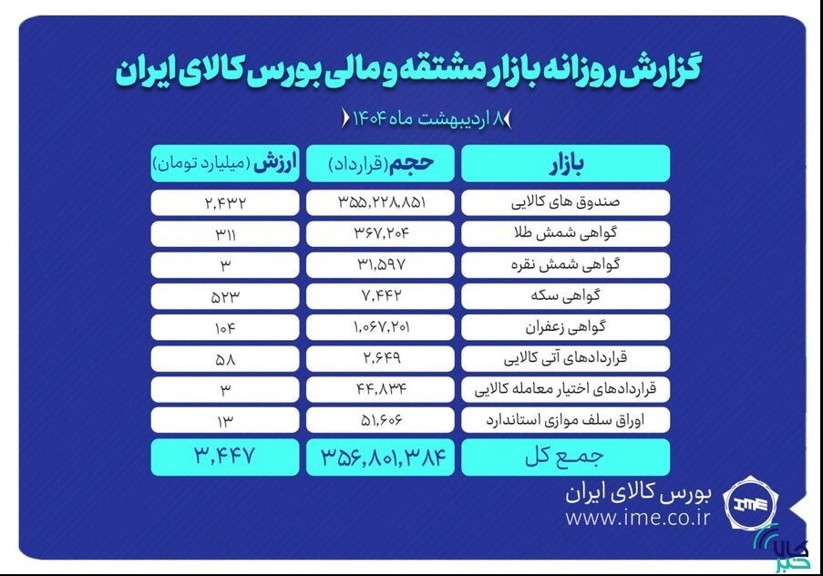 همچنین در معاملات روز گذشته بازار مشتقه و مالی، 355 میلیون و 228 هزار واحد صندوق کالایی به ارزش 2 هزار و 432 میلیارد تومان دست به دست شد.بیشترین حجم معاملات نیز به صندوق طلای عیار مفید(عیار) به میزان 63 میلیون واحد اختصاص یافت.