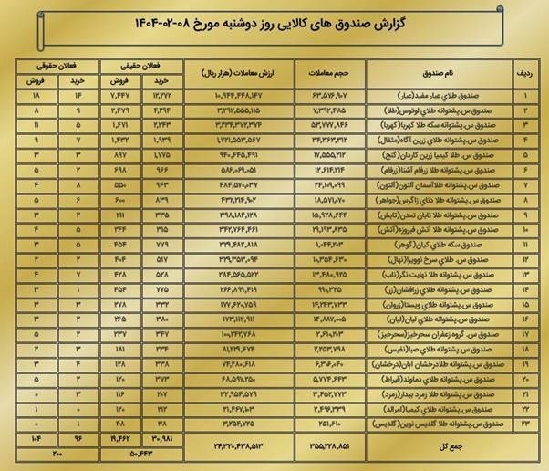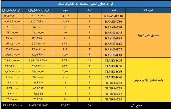 همچنین در در دادوستدهای روز گذشته 44 هزار و 834 قرارداد اختیار معامله به ارزش 3 میلیارد تومان منعقد شد. روز گذشته در دو نماد صندوق طلای لوتوس و کهربا معامله انجام شده است که بیشترین ارزش معاملات در قراردادهای اختیار معامله به صندوق طلای لوتوس اختصاص یافت.