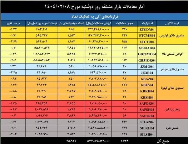 در دادوستدهای روز گذشته بازار قراردادهای آتی، 2 هزار و 649 قرارداد آتی به ارزش 58 میلیارد تومان منعقد شد. روز گذشته شاهد بیشترین حجم معاملات در قراردادهای آتی لوتوس بودیم که بیش از 28 درصد حجم معاملات قراردادهای آتی این روز را به خود اختصاص داد. بیشترین ارزش معاملات نیز، متعلق به نماد لوتوس بوده که ارزش آن به حدود 46 میلیارد تومان رسید.