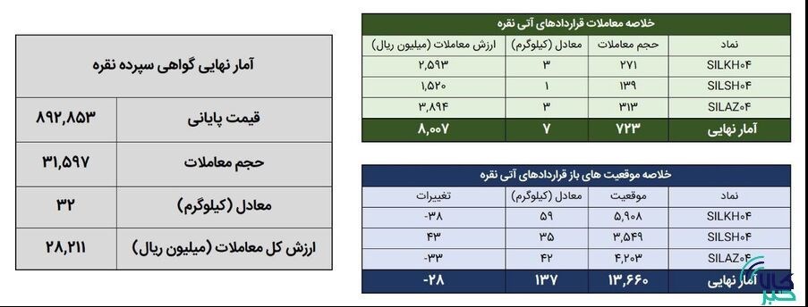 به گزارش پایگاه خبری «عصر بازار» به نقل از کالاخبر، خلاصه معاملات بازار نقره در روز گذشته نشان میدهد که در این روز 31 هزار و 597 گواهی معادل 32 کیلوگرم شمش نقره به ارزش حدود 2.8 میلیارد تومان دادوستد شد.