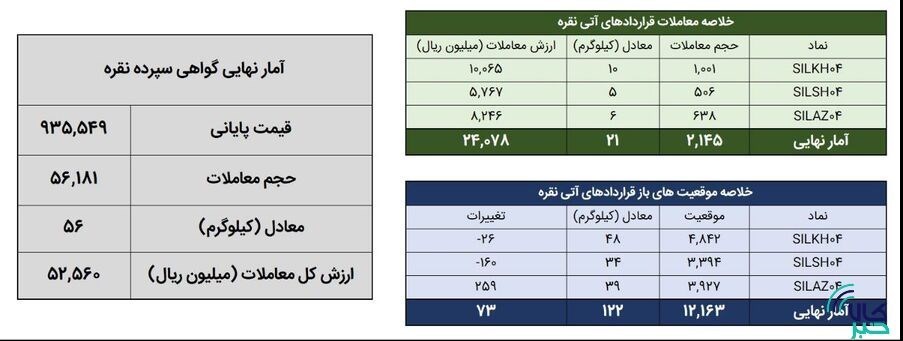به گزارش پایگاه خبری «عصربازار» به نقل از کالاخبر، خلاصه معاملات بازار نقره در روز گذشته نشان میدهد که در این روز 56 هزار و 181 گواهی معادل 56 کیلوگرم شمش نقره به ارزش حدود 5.2 میلیارد تومان دادوستد شد.