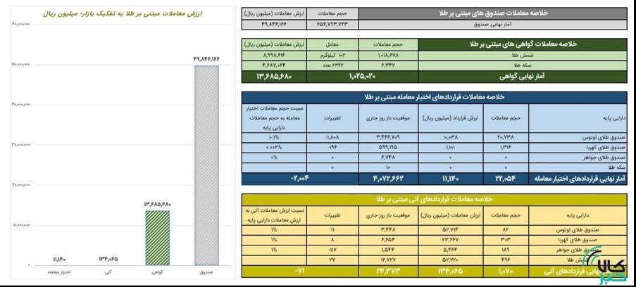 در قراردادهای اختیار معامله مبتنی بر طلا نیز 22 هزار و 54 قرارداد به ارزش حدود 1.1 میلیارد تومان دادوستد شد.همچنین هزار و 70 قراردادآتی مبتنی بر طلا به ارزش 13 میلیارد تومان دادوستد شد.