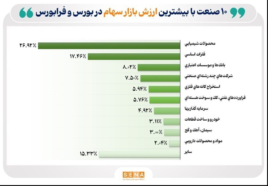 براساس این گزارش، از میان صنایع فعال در بازار سرمایه، محصولات شیمیایی با 27 درصد و ارزش بازار 31،407،285 میلیارد ریال، بیشترین ارزش بازار سهام بورس تهران و فرابورس را در اولین ماه امسال به خود اختصاص داده است.