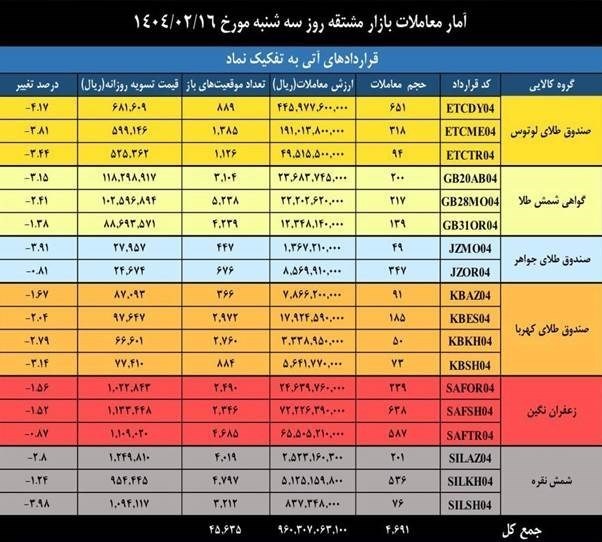 در دادوستدهای روز گذشته بازار قراردادهای آتی، 4 هزار و 691 قرارداد آتی به ارزش 96 میلیارد تومان منعقد شد. روز گذشته بیشترین حجم معاملات متعلق به قراردادهای آتی زعفران نگین بود که بیش از 31 درصد حجم معاملات قراردادهای آتی این روز را به خود اختصاص داد. بیشترین ارزش معاملات نیز به نماد لوتوس اختصاص یافت که در مجموع تمام قراردادهای آتی این نماد، حدود 69 میلیارد تومان بود.