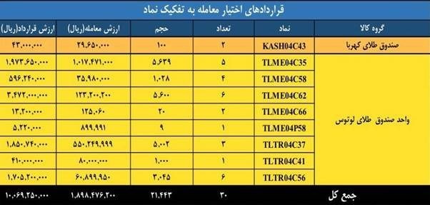 در در دادوستدهای روز گذشته بیش از 21 هزار و 443 قرارداد اختیار معامله به ارزش یک میلیارد تومان منعقد شد و بیشترین ارزش معاملات در قراردادهای اختیار معامله به صندوق طلای لوتوس اختصاص یافت.در این روز حجم معاملات تمام قراردادهای اختیار معامله صندوق طلای لوتوس 21،343 قرارداد بود.
