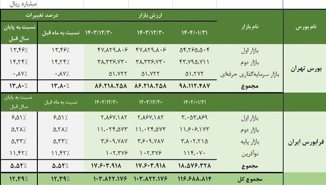 بر اساس این آمارها، ارزش بازار اول بورس تهران در پایان فروردین ماه با رشد 13.4 درصدی به 5426 همت، ارزش سهام بازار دوم بورس تهارن با رشد 14.2 درصدی به 4379 همت، ارزش سهام بازار سرمایهگذاری حرفهای با رشد 0.8 درصدی به 5.1 همت و در مجموع ارزش سهام بازارهای بورس اوراق بهادار تهران در پایان فروردین ماه 1404 به 9811 همت رسید؛ در حالی که ارزش آن در پایان اسفندماه 8621 همت بود.