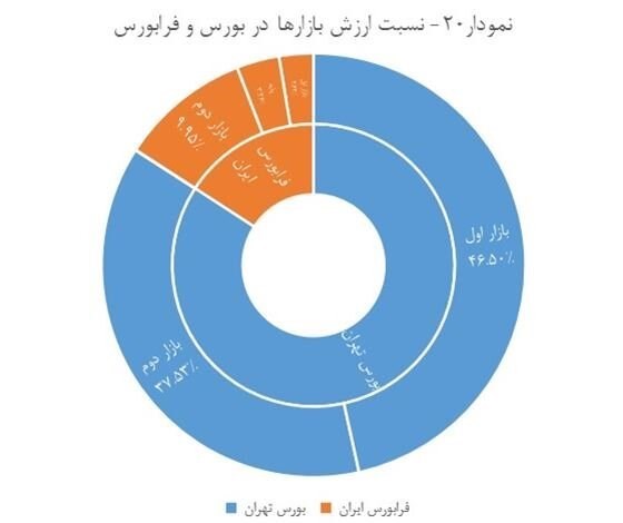 براین اساس، در پایان فروردین ماه سال جای ارزش سهام بازار اول بورس اوراق بهادار تهران 46.5 درصد، بازار دوم بورس اوراق بهادار تهران 37.5 درصد، بازار دوم فرابورس 9.9 درصد، بازار پایه فرابورس 3.2 درصد و بازار اول فرابورس 2.3 درصد از نسبت ارزش سهام بازارها در بورس و فرابورس را به خود اختصاص داد.