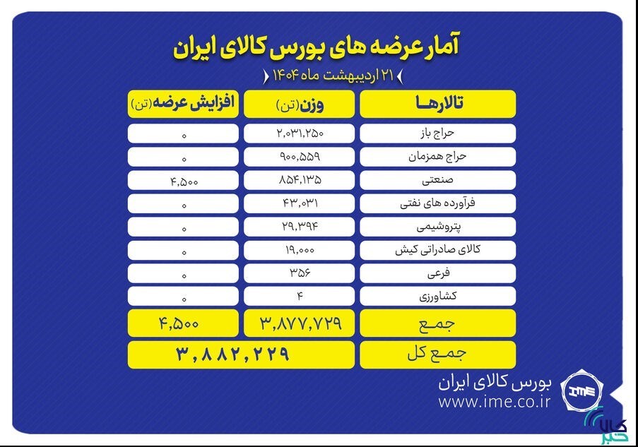در تالار حراج باز 2 میلیون و 31 هزار و 250 تن محصول شامل یک میلیون و 911 هزار و 700 تن سنگ آهن، 113 هزار و 500 تن وکیوم باتوم، 3 هزار و 50 تن مسو 3 هزار تن مواد شیمیایی عرضه می شود.