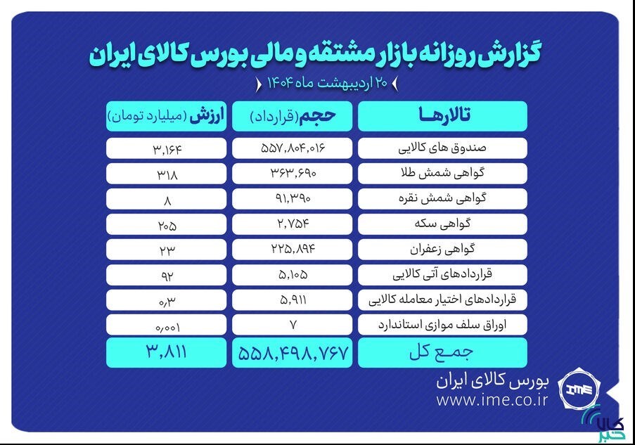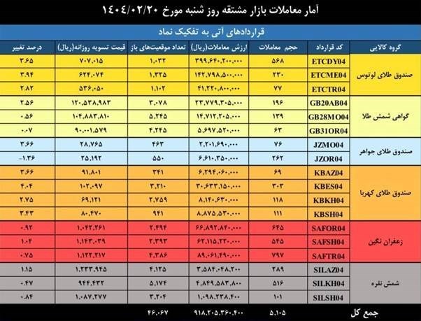 در دادوستدهای روز گذشته بازار قراردادهای آتی، 5 هزار و 105 قرارداد آتی به ارزش 92 میلیارد تومان منعقد شد. روز گذشته بیشترین حجم معاملات به قرارداد آتی زعفران نگین اختصاص یافت .بیشترین ارزش معاملات نیز، متعلق به نماد لوتوس بوده که در مجموع ارزش آن به حدود 58 میلیارد تومان رسید.