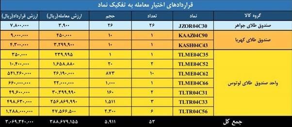 در در دادوستدهای روز گذشته بیش از 5 هزار و 911 قرارداد اختیار معامله منعقد شد.بیشترین ارزش معاملات در قراردادهای اختیار معامله به صندوق طلای لوتوس اختصاص یافت.در این روز حجم معاملات تمام قراردادهای اختیار معامله صندوق طلای لوتوس 5،865 قرارداد بود.