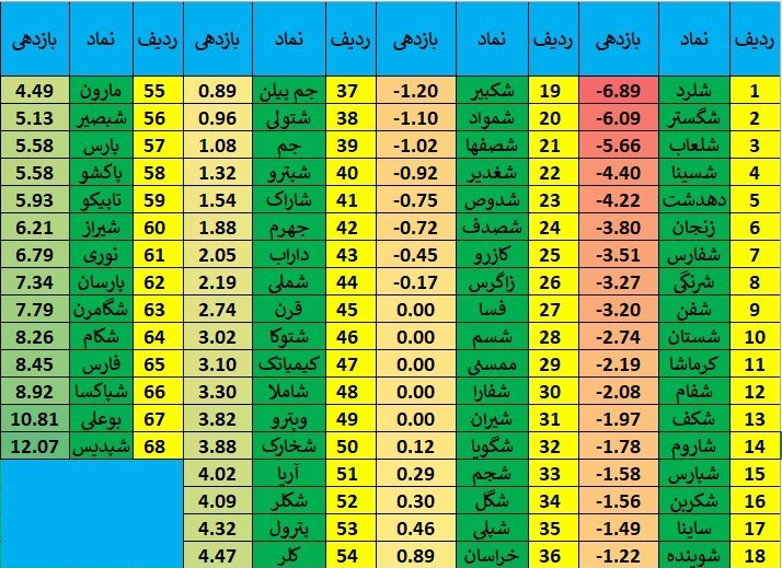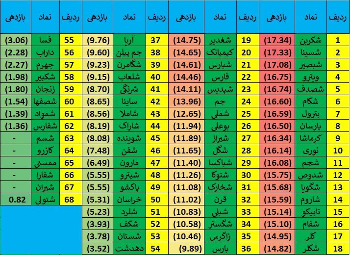 جدول زیر، بازدهی نمادهای مختلف صنعت محصولات شیمیایی را در بازه 18 تا 25 تیر به تفکیک نشان میدهد.
