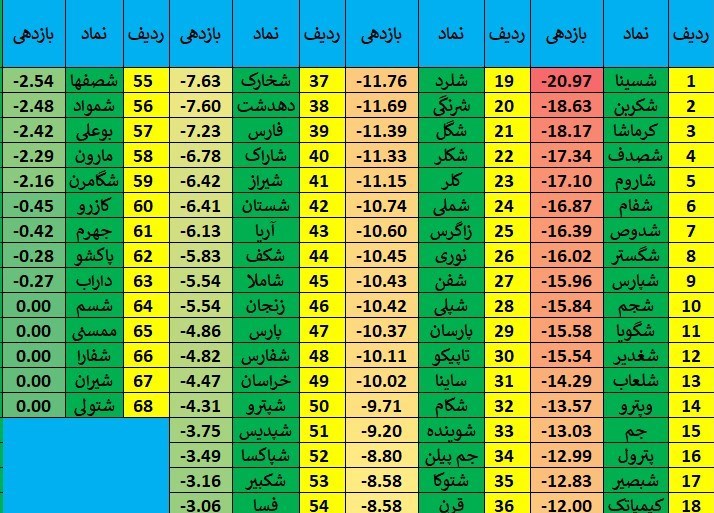 در بین شرکتهای دارای افت سنگین، شسینا با بازدهی منفی 20.97 درصد، شکربن با منفی 18.63 درصد و کرماشا با منفی 18.17 درصد، در صدر بدترین عملکردهای صنعت شیمیایی قرار دارند.