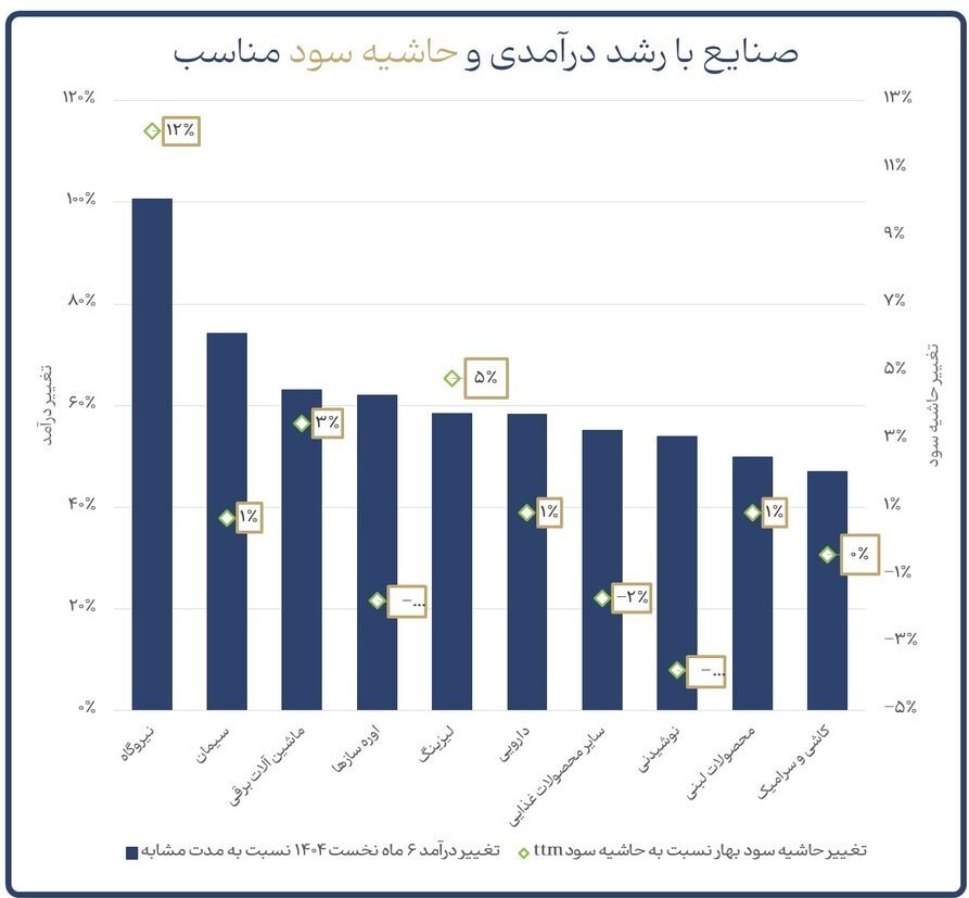 به گزارش پایگاه خبری «عصر بازار» به نقل از سنا، «تیم تحلیل مدیریت دارایی گندم» ضمن بررسی صنایع و نمادهای برتر بازار سرمایه، بر اساس مجموع درآمد 6 ماه 1404 و تغییرات حاشیه سود شرکتها و با در نظر گرفتن معیارهای انتخاب، شامل رشد درآمد و بهبود حاشیه سود، نوشت: