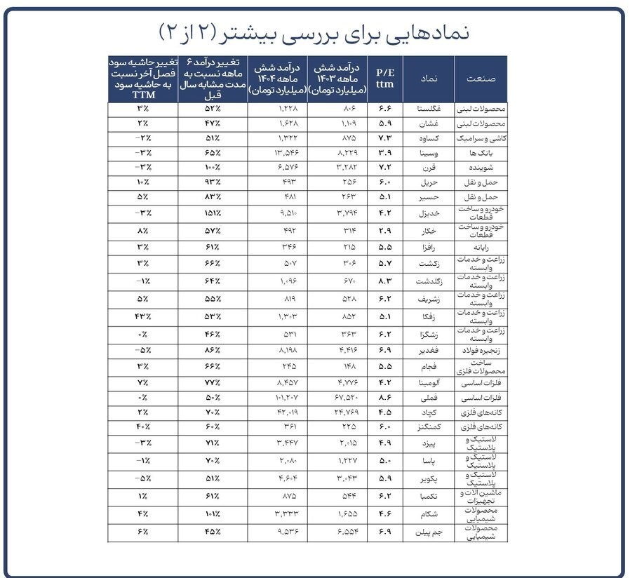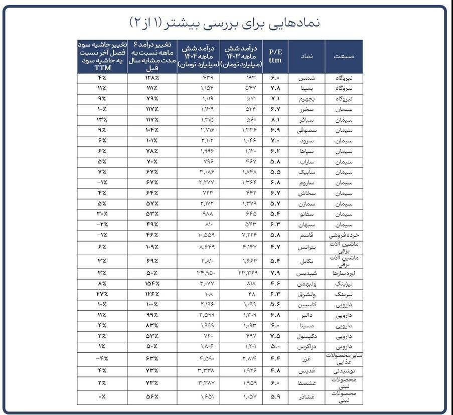 در نتیجه، مجموعهای از نمادها در صنایع منتخب و نیز برخی نمادهای مستعد از سایر گروهها شناسایی شدند. این شرکتها نه تنها از منظر رشد درآمدی، بلکه از لحاظ ثبات سودآوری و جذابیت نسبی نسبتهای مالی نیز شرایط مناسبی دارند.