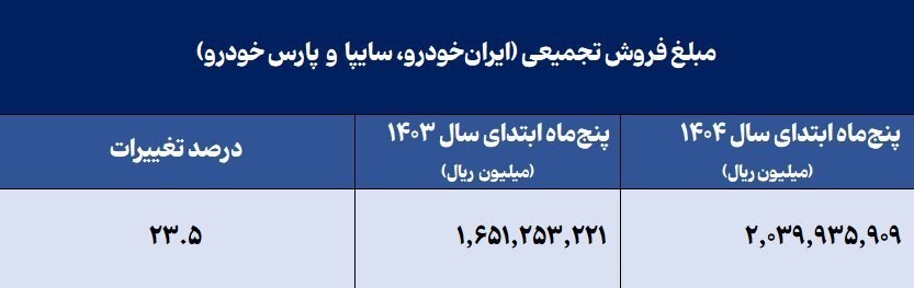 آمارهای ارائه شده در سامانه کدال نشان میدهد: مجموع درآمد فروش این 3 شرکت در 5 ماه نخست سال 1403 حدود 1,651,253,221 میلیون ریال ( معادل حدود 165 همت) بود که تحق درآمد 204 همتی در 5 ماه نخست سال جاری از رشد 23 درصدی درآمد این شرکتها حکایت دارد. این افزایش قابلتوجه به دلیل رشد تولید، عرضه محصولات جدید و بهبود تقاضا در بازار داخلی است.