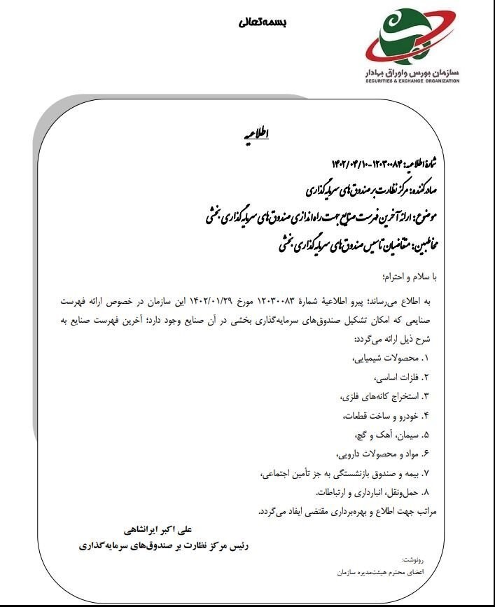 پیرو این اطلاعیه متقاضیان تاسیس صندوقهای سرمایهگذاری بخشی میتوانند در هشت صنعت شامل محصولات شیمیایی، فلزات اساسی، استخراج کانههای فلزی، خودرو و ساخت قطعات، سیمان- آهک و گچ، مواد و محصولات دارویی، بیمه و صندوقهای بازنشستگی بهجز تامین اجتماعی، حملونقل-انبارداری و ارتباطات، اقدام کنند.