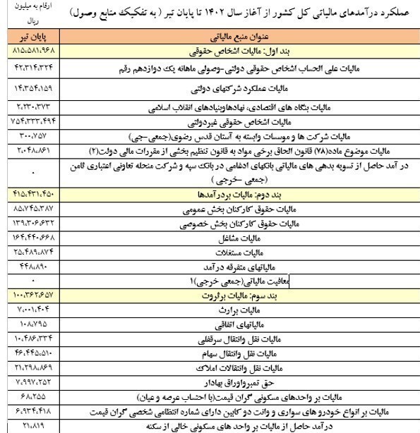 مجموع درآمدهای مالیاتی اعم از مالیاتهای مستقیم و مالیات بر کالاها و خدمات در 4 ماه نخست سال 1401؛ برابر با 143 هزار و 888 میلیارد تومان است که درآمد حاصل از مالیاتهای مستقیم رقم 87 هزار و 611 میلیارد تومان و درآمد مالیاتی حاصل از مالیات بر کالاها و خدمات رقم 56 هزار و 276 میلیارد تومان بوده است.