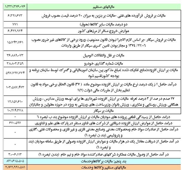 در بررسی درآمدهای مالیاتی مستقیم، مالیات بر اشخاص حقوقی 81 هزار و 558 میلیارد تومان، درآمد حاصل از مالیات بر درآمدها 41 هزار و 543 میلیارد تومان و درآمد حاصل از مالیات بر ثروت 10 هزار و 36 میلیارد تومان بوده است.