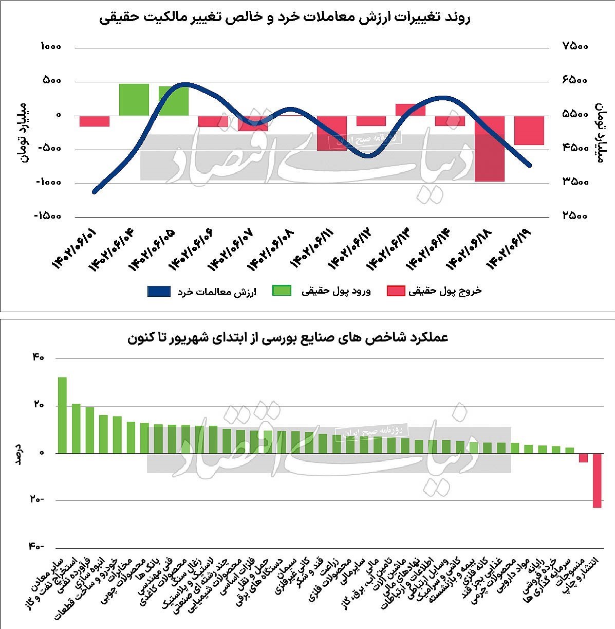 در روزی که گذشت، شاخصکل بورس تهران با افت 28/ 0درصدی همراه شد و نهایتا در محدوده 2میلیون و 123هزارواحدی کار خود را به اتمام رساند. این دومین روز متوالی بود که نماگر اصلی بازار سهام با کاهش ارتفاع همراه شد. شاخص هموزن نیز که نشانی از اثرگذاری یکسان کلیه نمادهای معاملاتی است و چهره بازار را به نحو مطلوبتری نمایش میدهد، با افت 30/ 0درصدی، در سطح 714هزار و 691واحدی بهکار خود خاتمه داد. در فرابورس نیز شاخص اصلی این بازار با کاهش 23/ 0درصدی همراه شد و پرونده معاملاتی خود در دومین روز هفته را با قرارگیری بر روی سطح 26هزار و 419واحدی بست. افزون بر این در روز گذشته، بازار سهام شاهد خروج 425میلیارد تومان از سرمایههای خرد و حقیقی بود تا همچنان حقیقیها در سمت عرضه و فروش نمادهای مختلف، قویتر از خریداران باشند. همچنین ارزش معاملات خرد بازار سهام که شامل سهام و حقتقدم میشود، با ثبت رقم 4هزار و 41میلیاردتومان، مجددا در مسیر نزولی گام برداشتهاست. بهعلاوه حجم معاملات بازار سرمایه نیز در روز گذشته با افت معناداری نسبت بهروز قبلی همراه شد و به 5میلیارد و 661میلیون برگه سهم رسید.