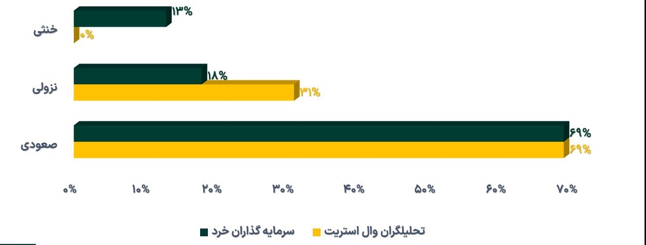 این هفته، 13 تحلیلگر وال استریت در نظرسنجی هفتگی کیتکو شرکت کردند. هیچ کدام از کارشناسان، انتظار ندارند که قیمت طلا در هفته آینده بدون تغییر باقی بماند. 9 نفر ، معادل 69 درصد از آنان، پیشبینی افزایش قیمت را دارند. 4 نفر از کارشناسان، معادل 31 درصد آنان، انتظار کاهش قیمت طلا را دارند.