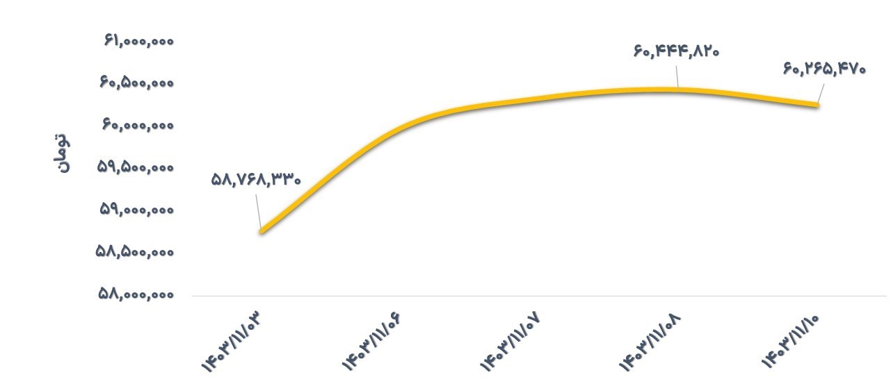 در این هفته قیمت سکه امامی در محدوده 60,444,820- 58,768,330 تومان معامله شد و در انتها با افزایش 2/5 درصدی به قیمت 60,265,470 تومان رسید. برآیند مثبت بازده دلار آزاد و قیمت هر انس طلا در بازار جهانی به افزایش قیمت سکه امامی منجر شد.