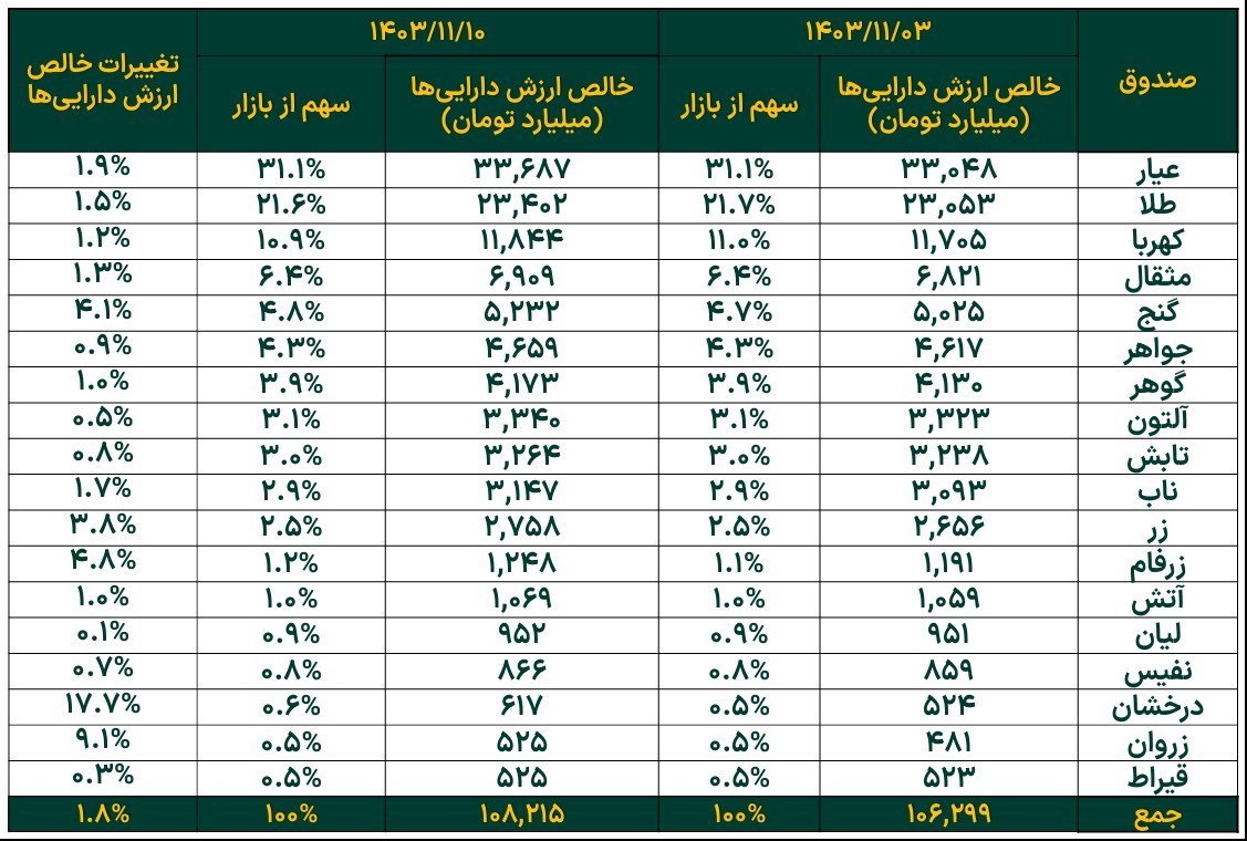 خالص ارزش دارایی صندوقهای طلا در تاریخ 1403/11/10 بالغ بر 108/2 همت بود که نسبت به هفته گذشته 1/8 درصد افزایش یافت.