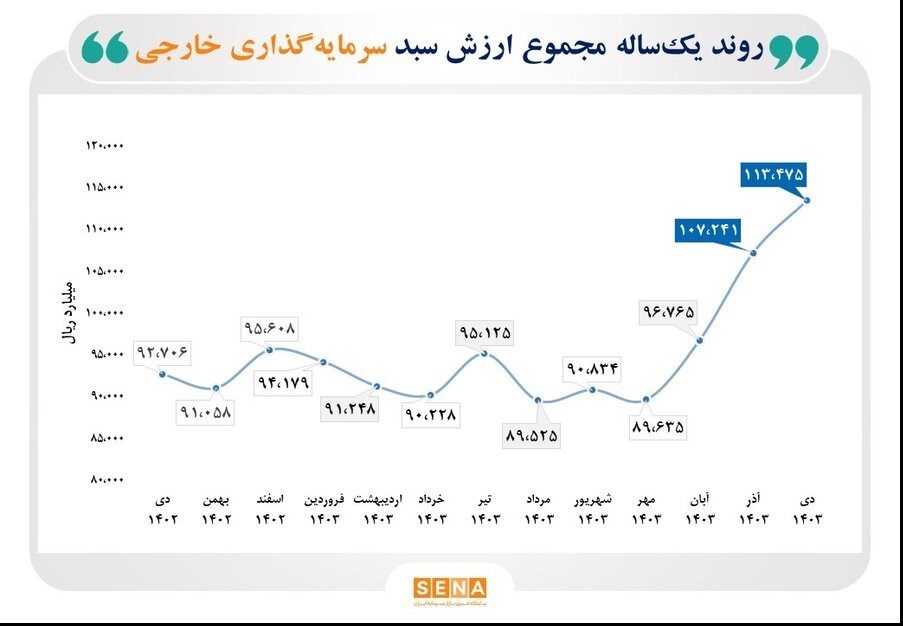 براساس این گزارش، مجموع ارزش سبد سرمایهگذاری خارجی از 92،706 میلیارد ریال دردی پارسال به 113،475 میلیارد ریال در دی امسال رسید.