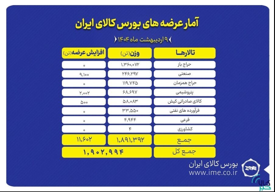 عصر بازار- تالارهای بورس کالای ایران امروز سه شنبه ۹ اردیبهشت ماه میزبان عرضه یک میلیون و ۹۰۲ هزار و ۹۹۴ تن انواع محصول است.