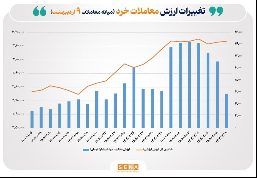 به گزارش پایگاه خبری «عصر بازار» به نقل از سنا، ارزش معاملات خُرد سهام امروز سهشنبه 9 اردیبهشت تا ساعت 10:25، به 5.7 هزار میلیارد تومان رسید.