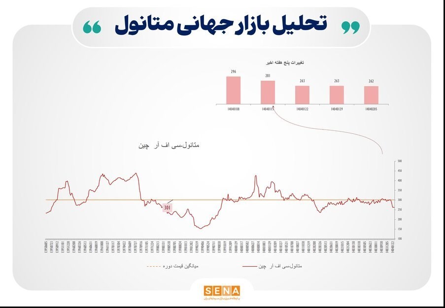 در هفته گذشته متانول سی‌اف‌آر چین با کاهش جزئی در قیمت، به طور میانگین 262 دلار بر هر تن معامله شد.