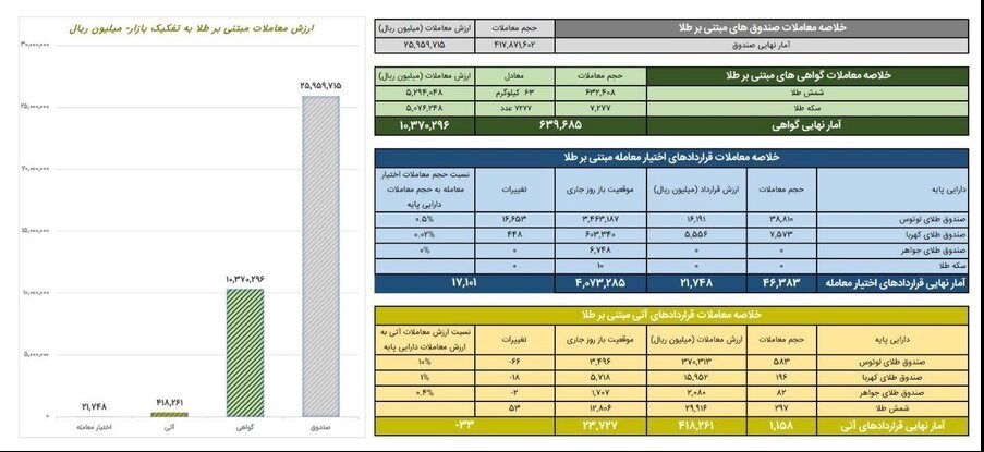 همچنین روز گذشته 417 میلیون و 871 هزار و 602 واحد صندوق های مبتنی بر طلا به ارزش 2.5 همت دادوستد شد.