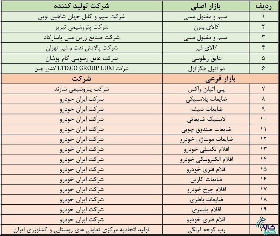 به این ترتیب کالاهای زیر در بازار اصلی پذیرش شدند: