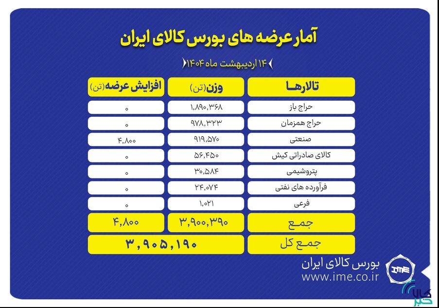 عصر بازار- تالارهای بورس کالای ایران امروز یکشنبه ۱۴ اردیبهشت ماه میزبان عرضه ۳ میلیون و ۹۰۰ هزار و ۳۹۰ تن انواع محصول است.