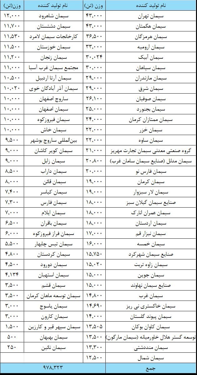 68 شرکت سیمانی که امروز محصول خود را روی تابلو می برند به ترتیب بالاترین حجم عرضه شامل سیمان تهران،سیمان هگمتان،سیمان هرمزگان،سیمان ارومیه،سیمان آبیک،سیمان سپاهان،سیمان مازندران،سیمان شرقفسیمان صوفیان،سیمان بجنورد،سیمان ممتازان کرمان،سیمان خزر،سیمان ساوه،گروه صنعتی معدنی سیمان تجارت مهریز،سیمان مدلل (صنایع سیمان سامان غرب)،سیمان فارس نو،سیمان کرمان،سیمان لار سبزوار،صنایع سیمان گیلان سبز،سیمان عمران انارک،سیمان اردستان،سیمان نیزار قم،سیمان خمسه،صنایع سیمان شهرکرد،سیمان زاوه تربت،سیمان جوین،صنایع سیمان نهاوند،سیمان غرب،سیمان خاکستری نی ریز،سیمان پیوند گلستان،سیمان کاوان بوکان،توسعه گستر هلال خاورمیانه (سیمان مارگون) و سیمان منددشتی هستند.