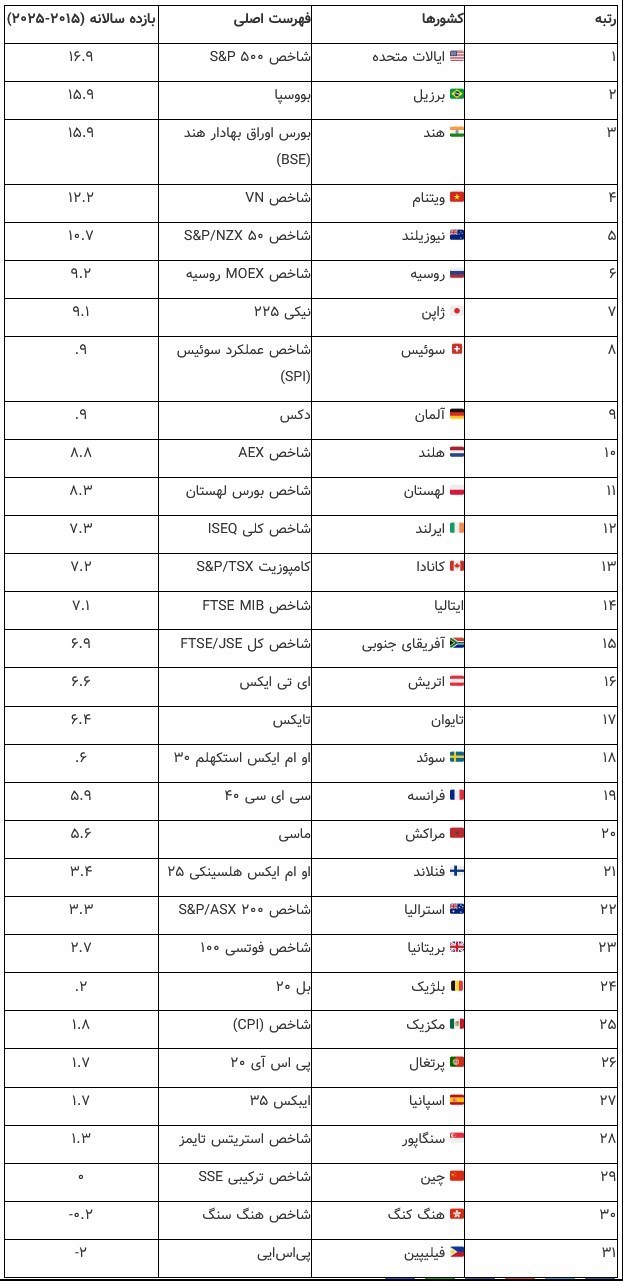 پربازدهترین بورسهای جهان در فاصله سال های 2015 تا 2025 میلادی - درصد