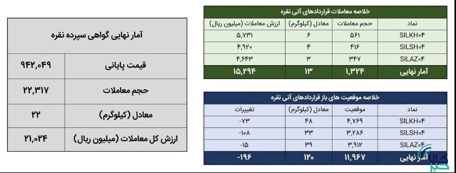 عصر بازار- در روز ۱۴ اردیبهشت ماه در مجموع حدود ۳۶ کیلوگرم شمش نقره در بازار گواهی سپرده و قرارداد آتی مورد معامله قرار گرفت.