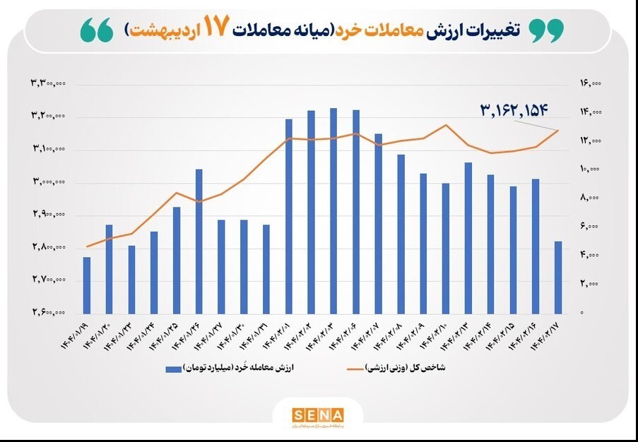 عصر بازار- دادههای آماری اداره تحلیلهای اقتصادی و ریسک سازمان بورس و اوراق بهادار نشان میدهد؛ ارزش معاملات خُرد سهام امروز چهارشنبه ۱۷ اردیبهشت تا ساعت ۱۰:۲۵، به بیش از ۵.۱ هزارمیلیارد تومان رسید.