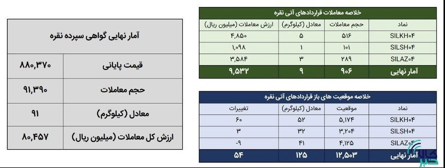 به گزارش پایگاه خبری «عصر بازار» به نقل از کالاخبر، خلاصه معاملات بازار نقره در روز گذشته نشان می‌دهد که در این روز 91 هزار و 390 گواهی معادل 91 کیلوگرم شمش نقره به ارزش بیش از 8 میلیارد تومان دادوستد شد.