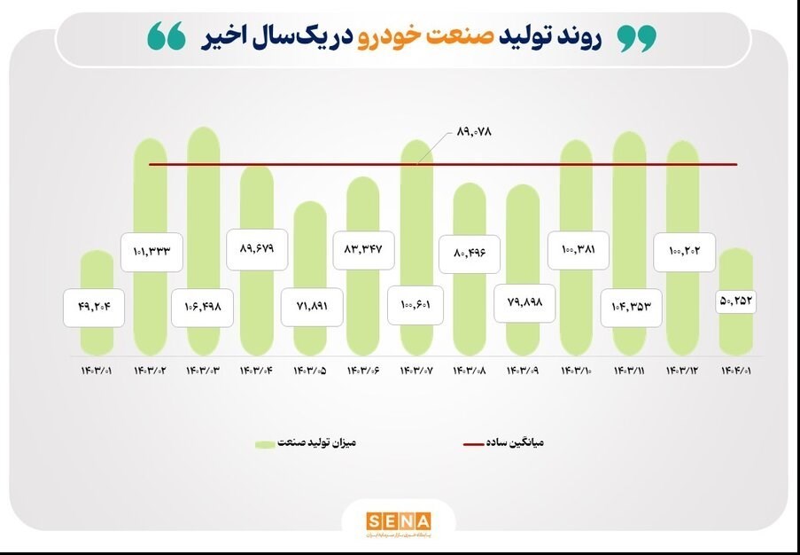 براساس این گزارش، میزان تولید صنعت خودرو در فروردین ماه 1404 نسبت به اسفند ماه 1403 به میزان 50 درصد کاهش داشته است.