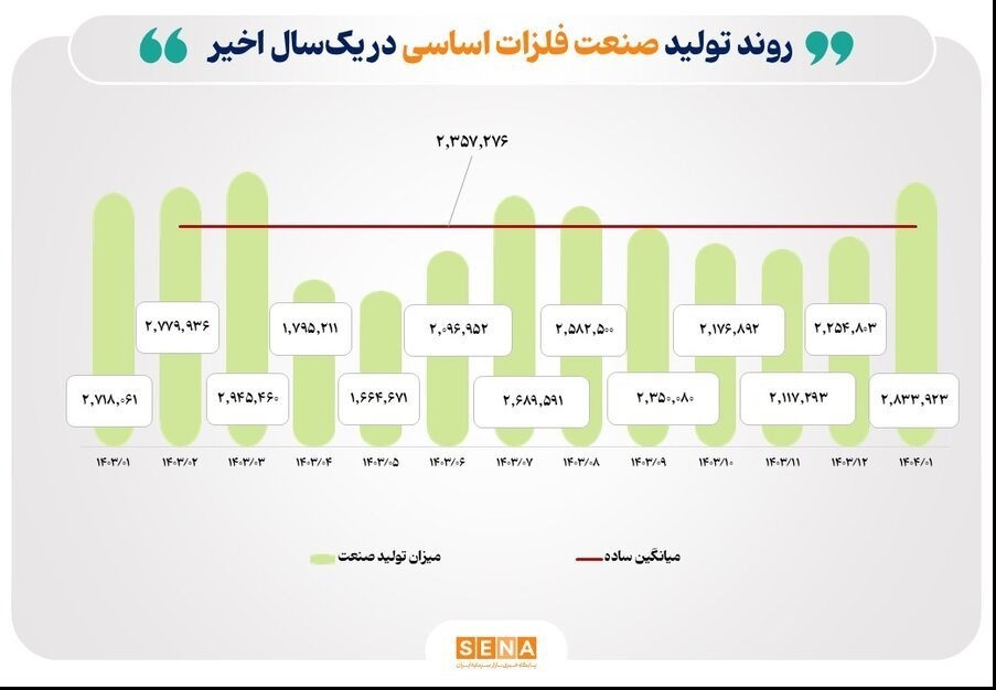 در بخش دیگر این گزارش آمده است؛ میزان تولید صنعت فلزات اساسی در فروردین ماه 1404 نسبت به اسفند ماه 1403 به میزان 26 درصد افزایش داشته است. بیشترین افزایش تولید مربوط به نمادهای فخوز (44%)، هرمز (167%)، کاوه (101%)، فولاد (8%)، فولاژ (41048 تن)، ارفع(107%)، فخاس (31%)، فجهان (37%) و فملی (10%) به شرح زیر است: