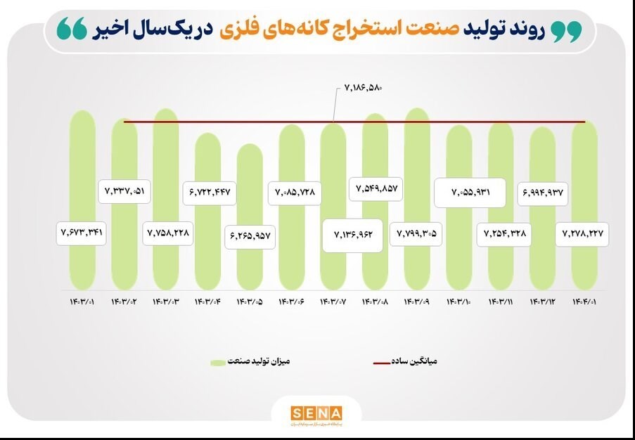 افزون براین، میزان تولید صنعت استخراج کانههای فلزی با افت 5 درصدی از 7 میلیون و 673 هزار و 341 تن در فروردین 1403 به 7 میلیون و 278 هزار و 227 تن در فروردین امسال رسیده است.
