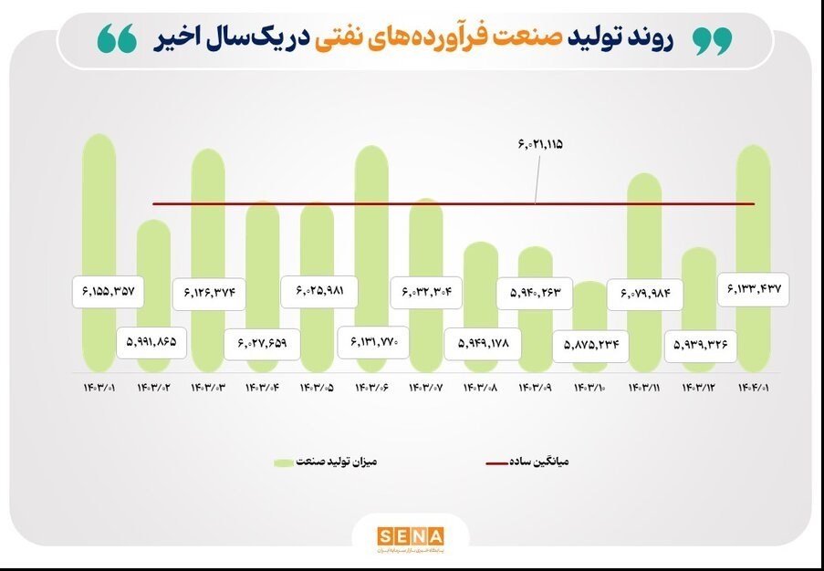 دادههای آماری این گزارش حاکی از آن است که میزان تولید صنعت فرآوردههای نفتی از 6 میلیون و 155 هزار و 357 مترمکعب در فروردین 1403 به 6 میلیون و 133هزار و 437 متر مکعب در فروردین امسال رسیده است. تولید این صنعت در یک سال گذشته، با افت اندکی روبهرو شده است.