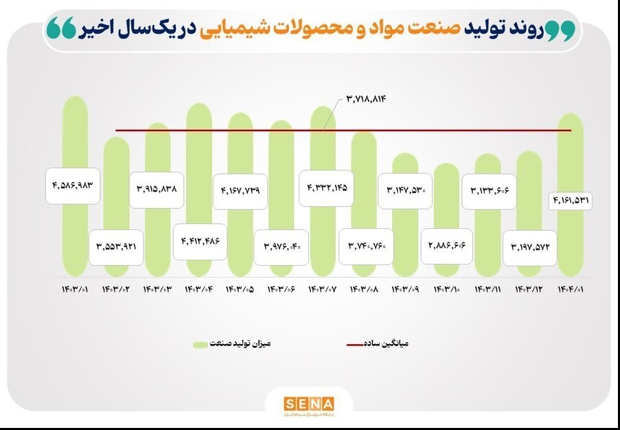 دادههای اداره میز صنعت حاکی از آن است که؛ صنعت مواد و محصولات شیمیایی از 4 میلیون و 586 هزار و 983 تن در فروردین 1403 به 4 میلیون و 161هزار و 531 تن در فروردین امسال رسیده است.