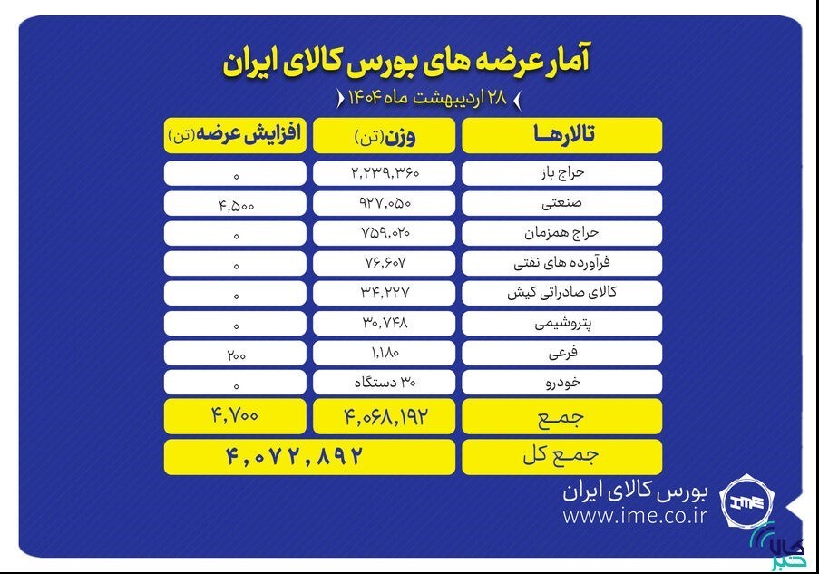 عصر بازار- تالارهای بورس کالای ایران امروز یکشنبه ۲۸ اردیبهشت ماه میزبان عرضه ۴ میلیون و ۷۲ هزار و ۸۹۲ تن انواع محصول است.