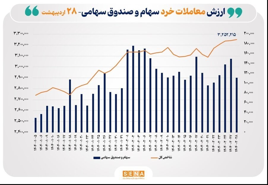عصر بازار- دادههای آماری مدیریت نظارت بر بورسهای سازمان بورس و اوراق بهادار حاکی از آن است که در معاملات امروز یکشنبه بازار سهام، ارزش معاملات خرد، شامل: «مبادلات سهام و صندوقهای سهامی»، از مرز ۱۱ همت عبور کرد.