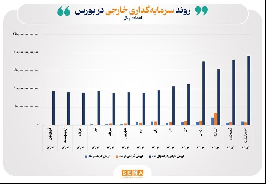 به گزارش پایگاه خبری «عصربازار» به نقل از سنا، طبق دادههای آماری مدیریت نظارت بر بورسهای سازمان بورس، ارزش دارایی سرمایهگذاران خارجی با رشد 7 درصدی از 18 همت در پایان فروردین به 19.2همت در اردیبهشت امسال رسید.