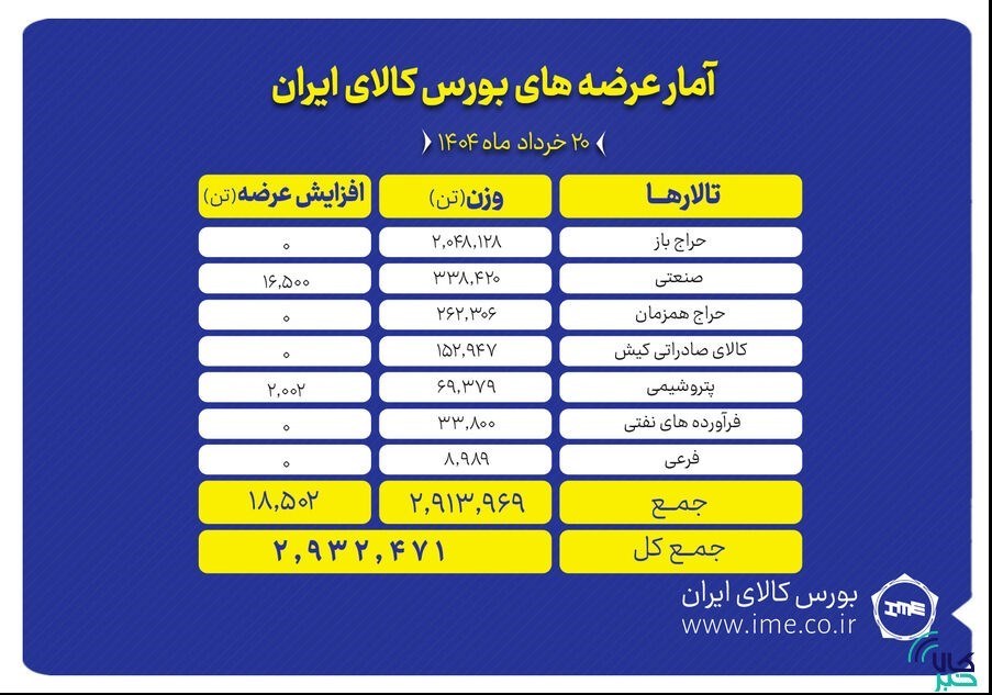 عصر بازار- تالارهای بورس کالای ایران امروز سه‌شنبه ۲۰ خرداد ماه میزبان عرضه ۲ میلیون و ۹۱۳ هزار و ۹۶۹ تن انواع محصول است. بیشترین عرضه امروز در تالار حراج باز رقم می خورد.