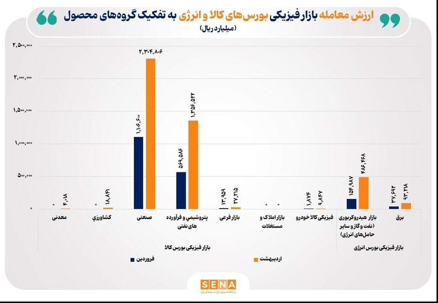 ارزش معاملات بازار فیزیکی بورس کالا شامل کالاهای معدنی، کشاورزی، صنعتی، پتروشیمی و فرآوردههای نفتی، بازار فرعی، بازار املاک و مستغلات و خودرو حدود 203 همت در اردیبهشت ماه امسال رسید.