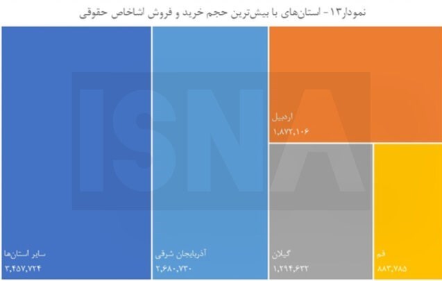 مطابق آمارها، اشخاص حقوقی در خردادماه سال جاری در مجموع 32 هزار و 349 همت معاملات برخط و غیر برخط انجام دادند که سهم عاملات برخط 16 هزار و 762 همت بوده که نسبت به مدت مشابه در سال قبل 28 درصد رشد اما نسبت به ماه قبل این گزارش (اردیبهشت ماه) 54 درصد کاهش داشته و پنج استان تهران با 14 هزار و 567 همت، آذربایجان شرقی با 268 همت، اردبیل با 187 همت، گیلان با 129 همت و قم با 88 همت در جایگاه اول تا پنجم قرار گرفتهاند.