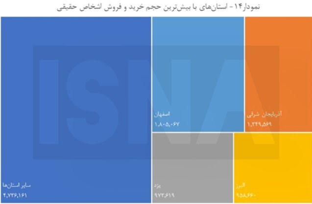 همچنین، در خردادماه سال جاری، مجموع معاملات برخط و غیر برخط اشخاص حقیقی طی این ماه به 27 هزار و 289 همت رسید که سهم معاملات برخط 24 هزار همت بود و استانهای تهران با 2224 همت، اصفهان با 180 همت، آذربایجان شرقی با 134 همت، یزد با 97 همت و البرز با 95 همت در جایگاه اول تا پنجم قرار دارند که در مجموع نسبت به خردادماه سال قبل 194 درصد افزایش روبرو بوده اما نسبت به ماه قبل یعنی اردیبهشت ماه سال جاری 69 درصد کاهش در معاملات وجود داشته است.